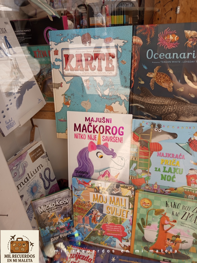 Tras comprar algunos souvenirs, el peque se fijó en una librería; en el escaparate estaba un libro que él tiene en casa, pero naturalmente ¡En croata! Le llamó mucho la atención 😅