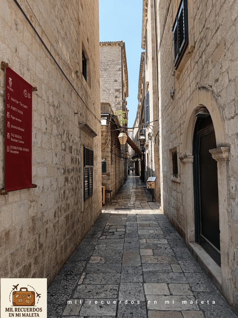 Al salir de la muralla nos adentramos en el casco antiguo de Dubrovnik, con la sensación de estar sumergidos de lleno en el ambiente de Juego de Tronos. El tono dorado de la piedra en calles y edificios, unido a los carteles de calles y monumentos, que parecen auténticos pergaminos de color rojo, crean un entorno medieval único que te transporta a otra época.