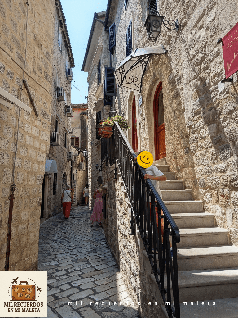 Entre sus calles empedradas descubrimos rincones con fachadas antiguas llenas de detalles, ventanas con contraventanas de madera, balcones floridos y carteles en forma de pergamino que nos recordaban mucho a los que habíamos visto en Dubrovnik. El ambiente medieval se respiraba en cada esquina, acompañado, cómo no, por la presencia de los gatos de Kotor, que parecen ser los verdaderos dueños de la ciudad. Nos sorprendió ver que incluso tienen comederos repartidos por las plazas y calles para cuidarlos.